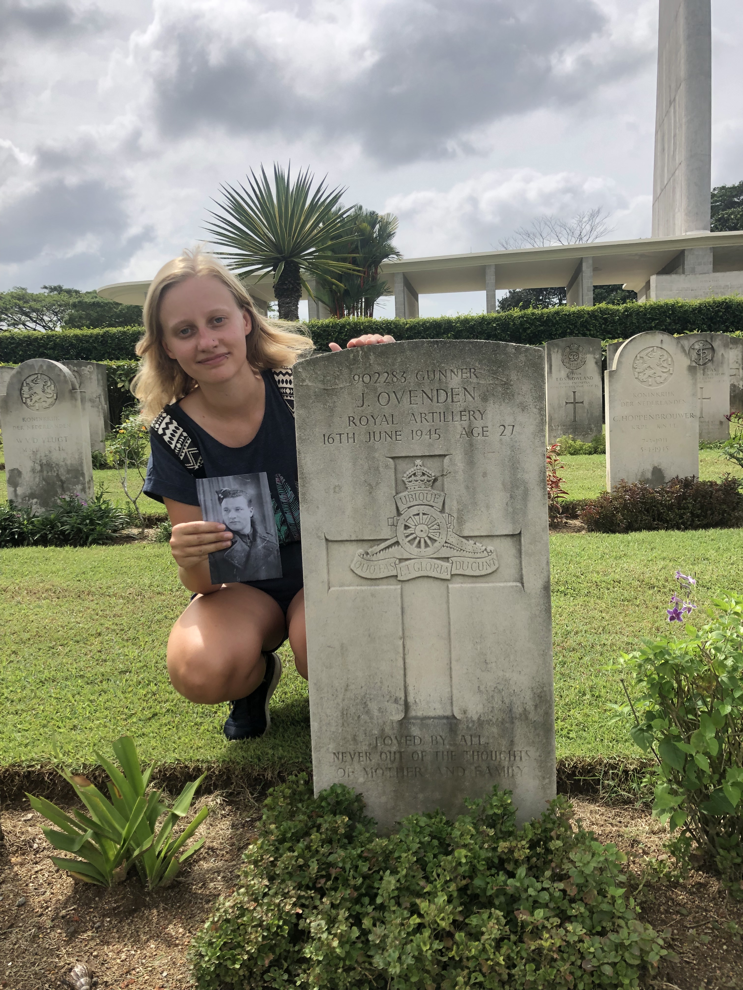 The memorial at the top of the cemetery was a striking one, listing the names of all those lost. There were many rows of pristinely/kept graves, with elegant planting. Following my mum’s detailed instructions, I easily found my great uncle’s grave. I’d taken along a photo of him which I propped up against the grave. It occurred to me that he had been buried there, so far from home, for 72 years. I felt sad and lonely for him, so I sat with him for a long time, and told him about our family now. I felt sad to leave, but pleased to have visited – it’s such an important part of my family’s history. If I ever return to Singapore I will make another trip. In the words of his mother, who wrote to him during the war, ‘Keep Smiling Joe’.